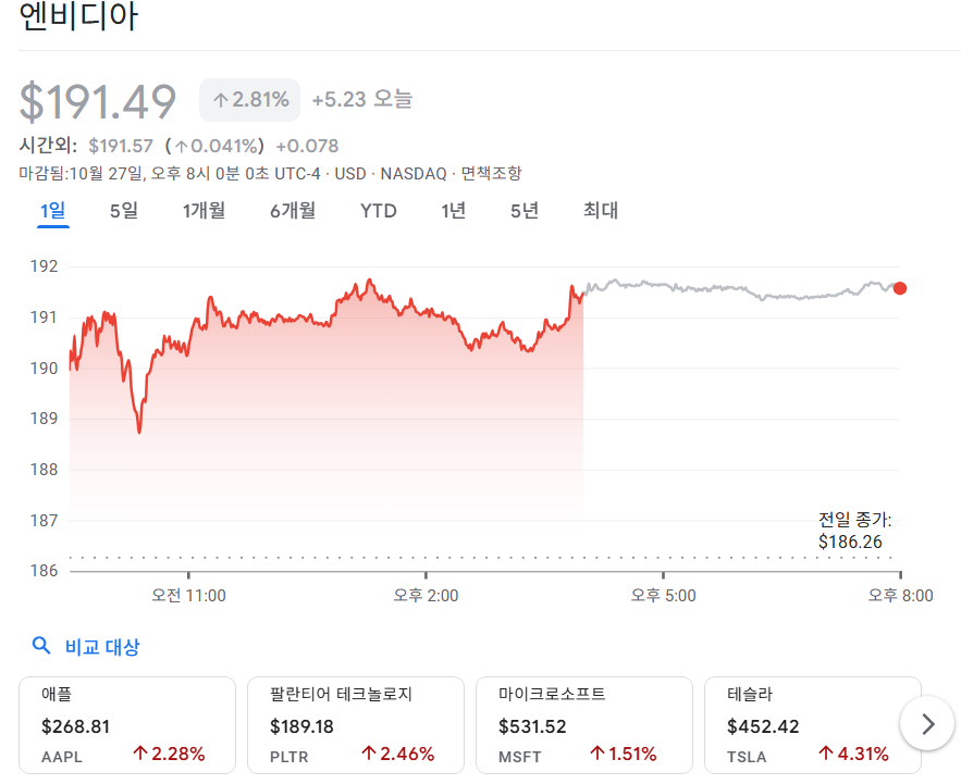 - 최근 주가(10월 28일): 191.49달러, 연초 대비 +90% 이상 급등, AI 수요 폭발과 CUDA 생태계 락인효과가 마진, 성장성 모두 압도적으로 지지하고 있음.