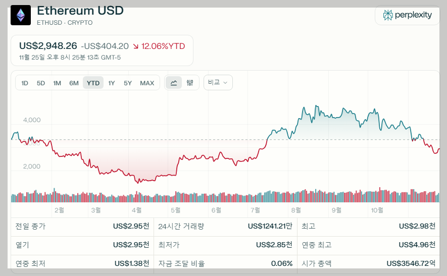 - 이더리움 및 주요 알트코인은 비트코인 대비 더 큰 낙폭을 보였다. 예를 들어 11월 초 이더리움은 최근 고점 대비 약 16% 하락한 3,300~3,400달러 박스권에 머물렀고, 중형 알트는 30% 이상 빠진 종목도 적지 않았다.